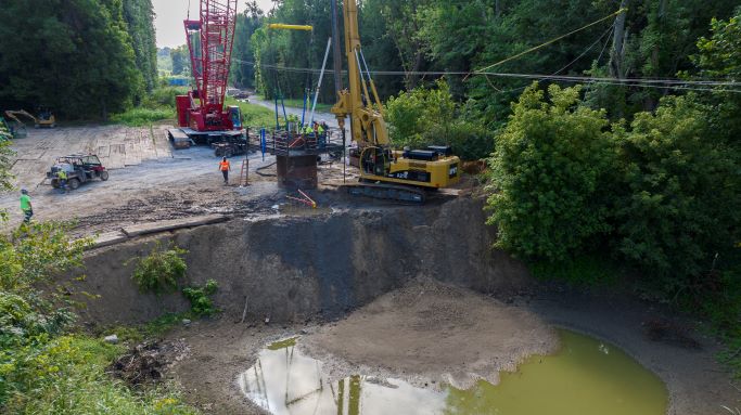 Au cours des 10 semaines suivantes, l’équipe a effectivement accompli le travail, en installant les sept fondations – cinq sur la rive ouest de la rivière et deux sur la rive est.
