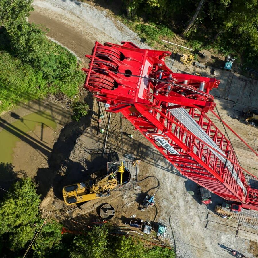 Thus, the need for seven steel casings, each eight-feet wide and a half-inch thick, ranging from 70 to 95 feet in length. Inside each of those casings was placed a steel rebar cage, ranging from 14,000 to 46,000 pounds and held in place by approximately 130 yards of concrete – in other words, nearly 15 cement trucks worth. Top it off with an anchor-bolt cage that the 80-foot pole will attach to, and you’ve got more than Paul Bunyan himself could do by hand. Hence the need for a 300-ton crawler crane with a 130-foot mast.
