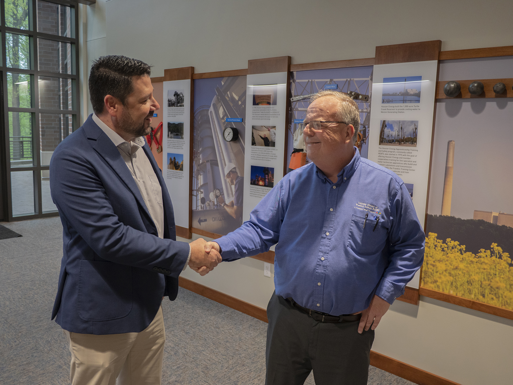 Clark County CEO Jason Clemmons, left, and UDWI CEO Doug Childs, right, greet each other at Hoosier Energy headquarters.