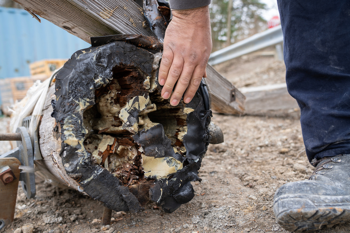 Com um direito de passagem atravessando a Área de Recreação Estadual de Redbird, no Condado de Greene, na primavera passada um buraco foi visto em um dos postes da Estrutura 80.