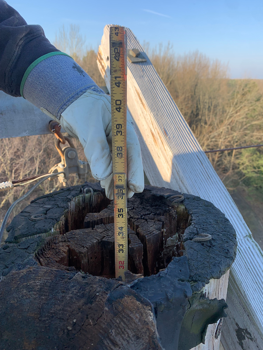 O encarregado de linha Aaron Price mede a profundidade do buraco feito pelos pica-paus em um poste da Hoosier Energy.